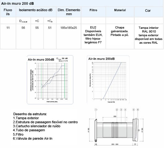 O arejador de parede Air-In 200 dB é composto por uma válvula mural, um tubo de ventilação flexível, um cartucho silenciador de ruídos exteriores e uma tampa exterior Air-In 200. Graças ao tubo de ventilação flexível, o isolamento do ruído é muito melhor.