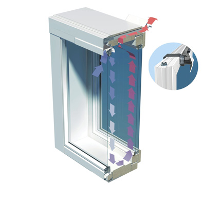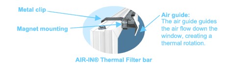 Cold air flows through the outer grille over the top frame to the thermal Air-In® filter bar which both efficiently filters the air and guides it down the cold surface of the external window, creating a thermal rotation in the window interspace.