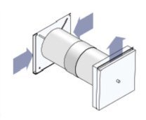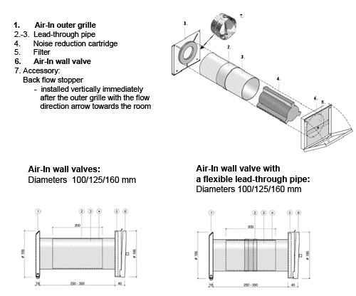 The Air-In 200 dB and Air-In 125J dB wall valves consist of the Air-In wall valve, flexible lead through pipe and an Air-In 200 outer grille / Air-In 125 outer grille.